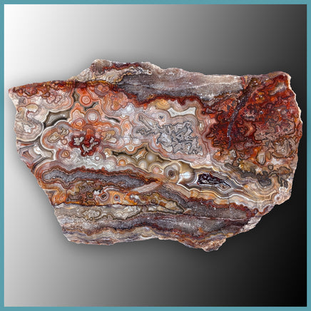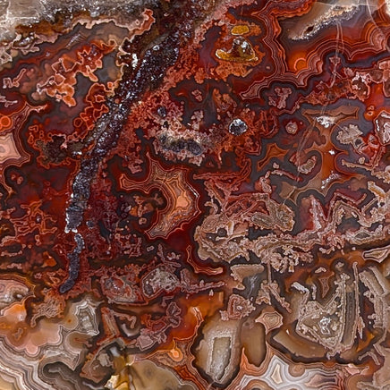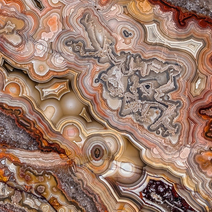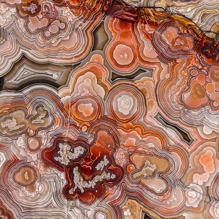 Laguna Lace Agate, often called Red Lace Agate, comes from northwestern Chihuahua, Mexico in a region known for lace agates. While red and white are prevalent colors, it also frequently shows yellow, orange, pink, or even blue or purple. Sections or bands of quartz are common in this vein agate, as well as intricate patterns as a result of tube formations or pseudomorphs of calcite crystals.