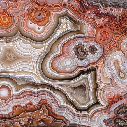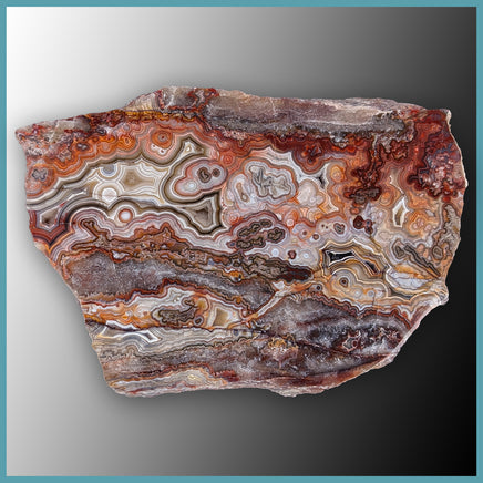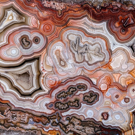 Laguna Lace Agate, often called Red Lace Agate, comes from northwestern Chihuahua, Mexico in a region known for lace agates. While red and white are prevalent colors, it also frequently shows yellow, orange, pink, or even blue or purple. Sections or bands of quartz are common in this vein agate, as well as intricate patterns as a result of tube formations or pseudomorphs of calcite crystals.