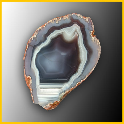 This Swazi Agate polished specimen features tight white banding with parallax, along with pale blue, and dark blue-gray to dark brown-gray agate. A healed fracture goes across the center, and the bottom has significant water-level banding.