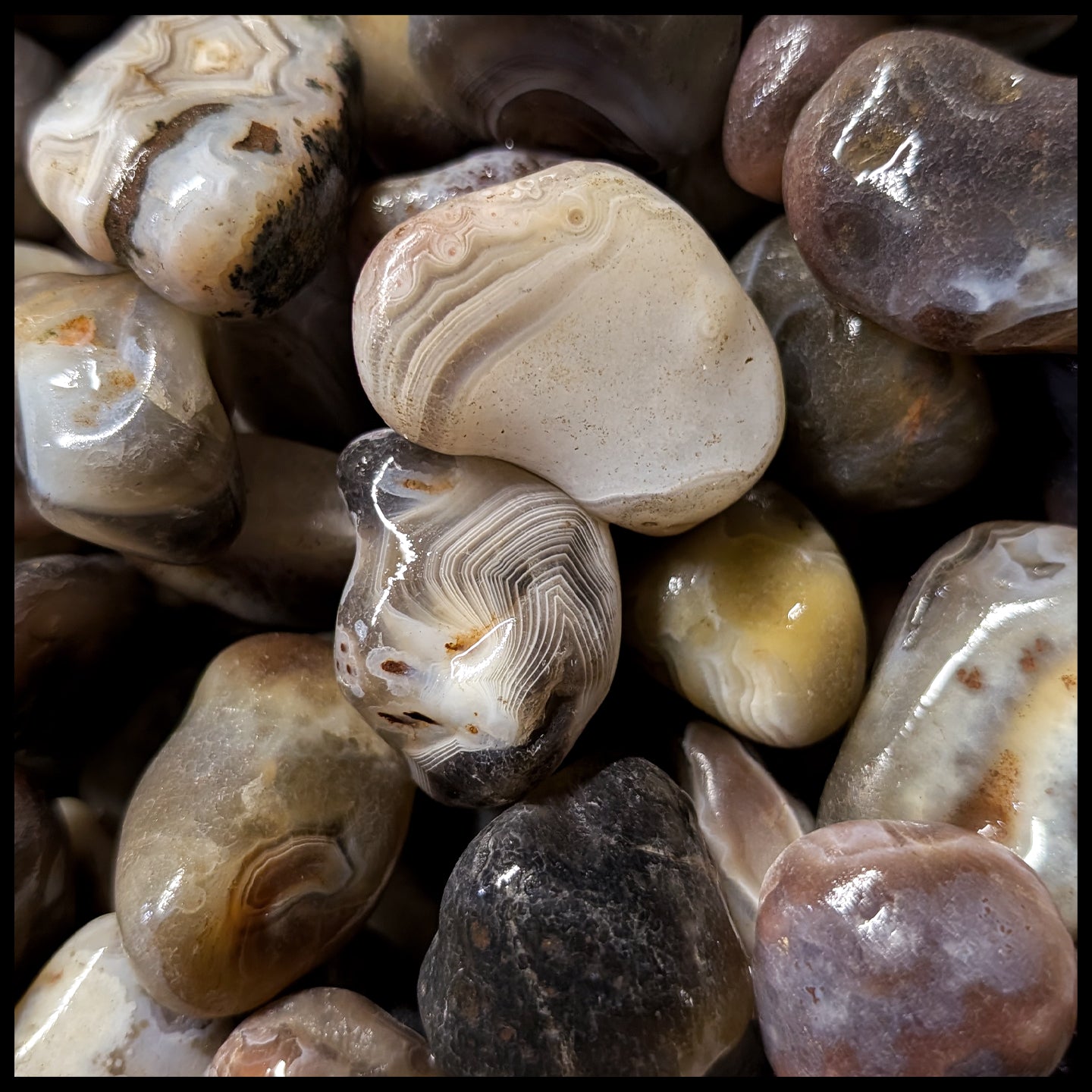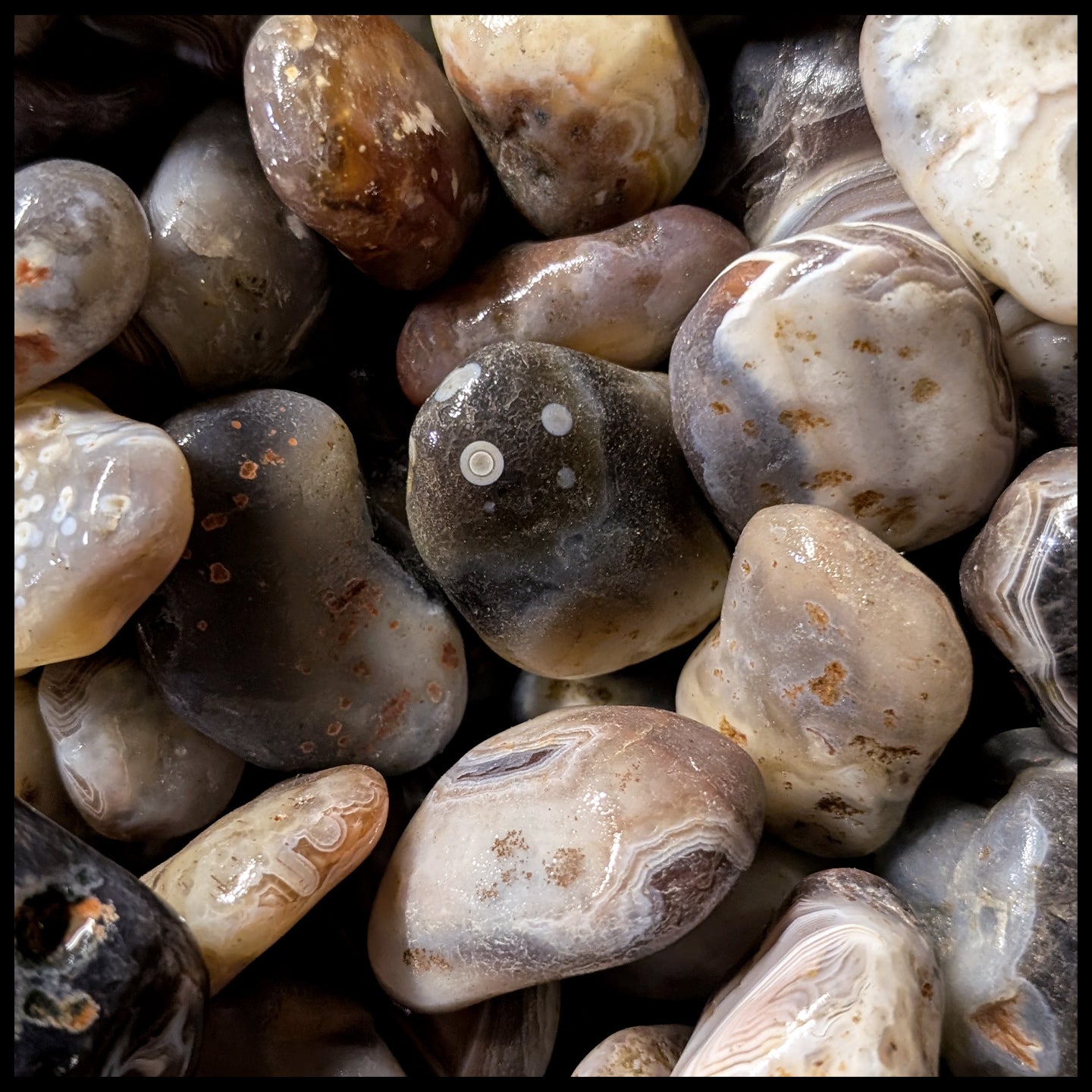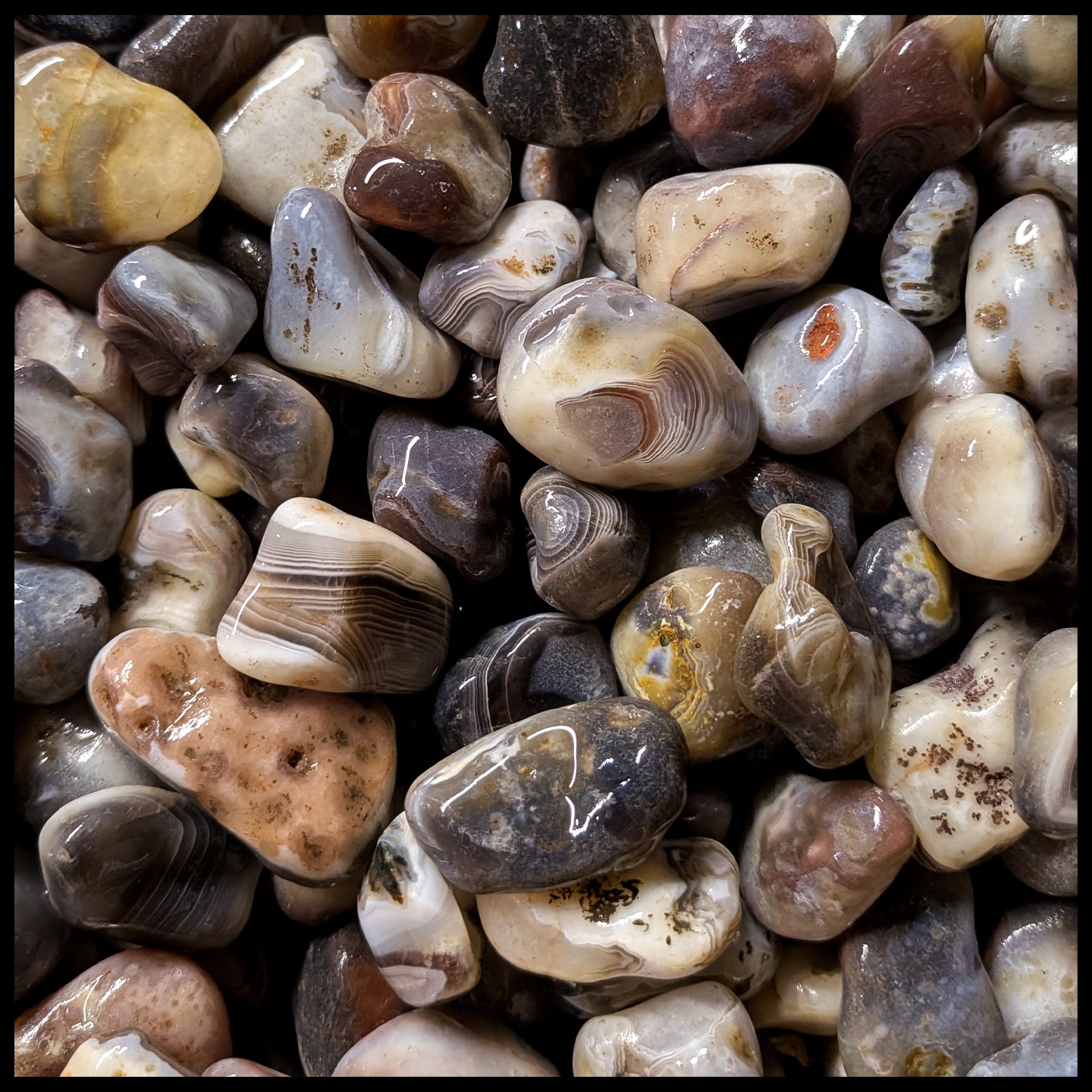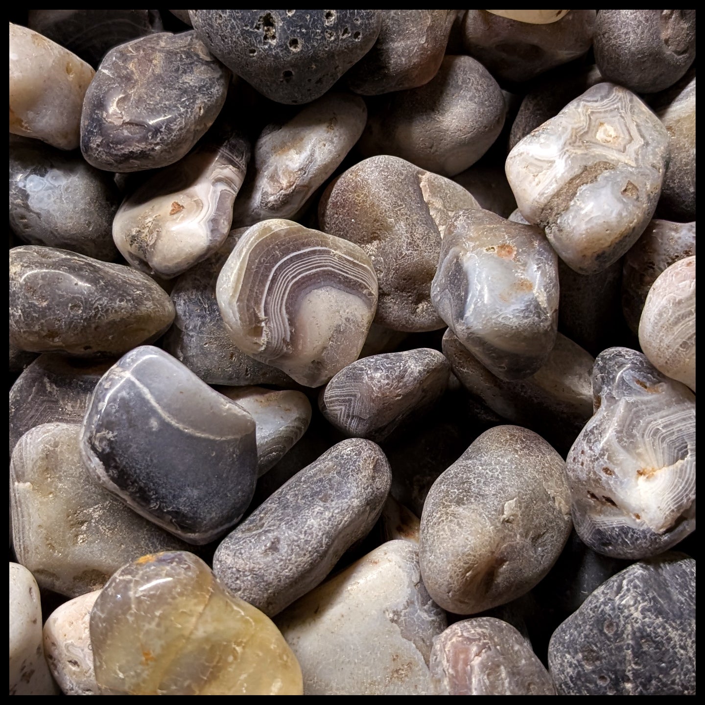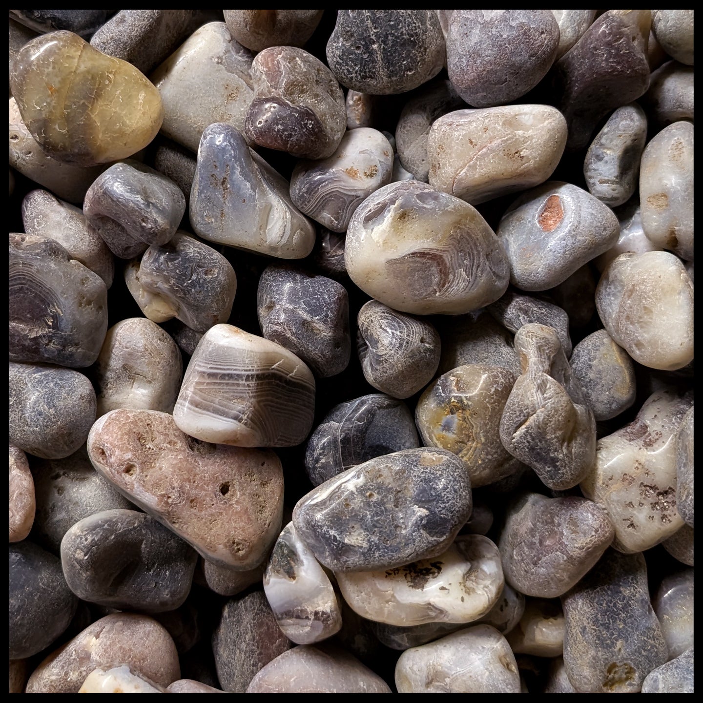 From Botswana, this agate has fine banding in primarily whites and grays, with occasional peach or pink pieces. Botswana Agate has a higher chance of having eyes than most other agates. Pieces .75" - 1.75"