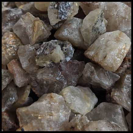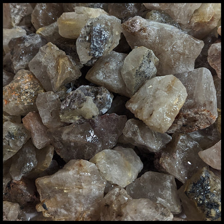 Tumbling size rough material in Rutilated Quartz, a clear to light yellow quartz with golden rutile needles.