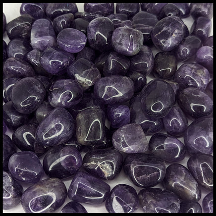Tumbled Amethyst from Zambia. This is a deep, dark purple quartz, tumbled in 1/2" to 1" pieces. Approximately 30-45 pieces per 1 pound lot.