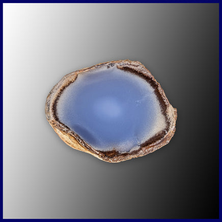 This Blue Chalcedony nodule comes from Turkey, and has a polished surface and a natural back full back. It shows shades of blue chalcedony in the center with speckled texturing toward the outer edge with a dark brown band.