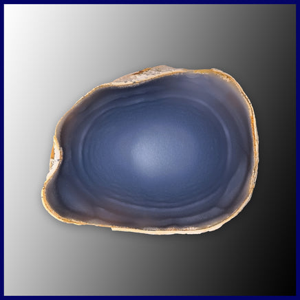 This Blue Chalcedony nodule comes from Turkey, and has a polished surface with a full natural back. It shows translucent shades of blue chalcedony with gentle concentric banding and a lighter center.