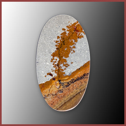 Blue Mustang Picture Jasper is mined by The Gem Shop in southeast Oregon. This polished cabochon features a golden brown landscape with red and black patterning, with a pale blue-gray sky.