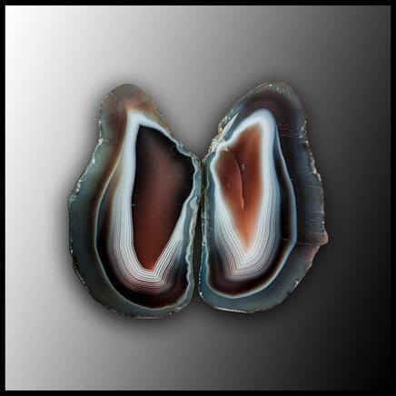 This polished specimen pair features black, white, and orange-red banded agate with parallax. The tops of both sides are polished over a slight curve.