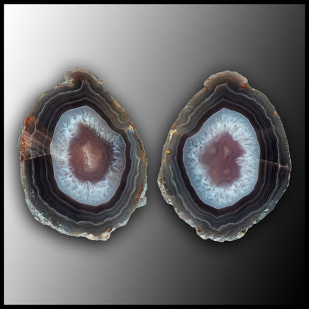 This polished specimen pair features banded agate in gray, white, and pink, with a quartz ring.