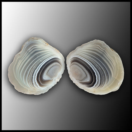 This Botswana Agate polished specimen pair features pale cream and gray banded agate, with some opaque white and darker gray bands and strong parallax throughout.