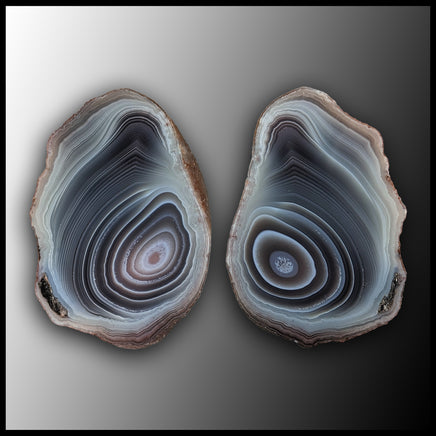 This Botswana Agate polished specimen pair features cloudy shades of gray with hints of reddish brown shades, with white banding and night/day centers.