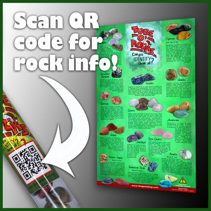 Tube O' Rocks is a tube of rocks! Pour it out, discover all the different colors inside, and then test your identification skills! Scan the QR code on the tube to view the whole list of possible tumbled stones inside. Here you can read about each, view example images, and see if you can collect them all! You can save the identification sheet right to your phone for a handy reference.