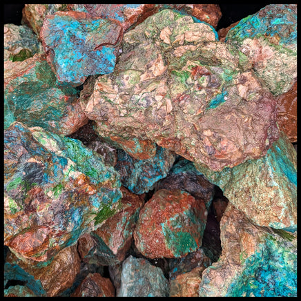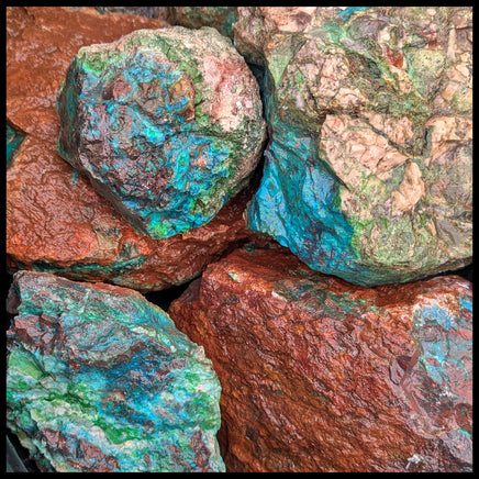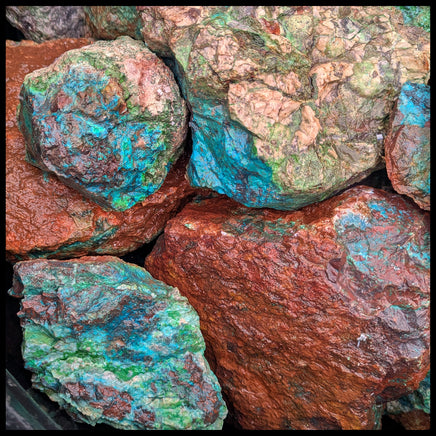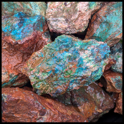 Chrysocolla from Mexico. It shows vibrant shades of blue and green inside a brown crust. This material is recommended for slabbing and cabochons.