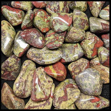 1 lb lot contains approximately 30 pieces of 1" fully tumbled stone. Also called Dragon Stone, features dark green and red and has lots of patterning/texture.
