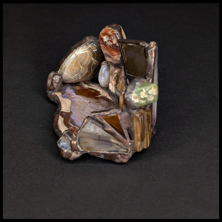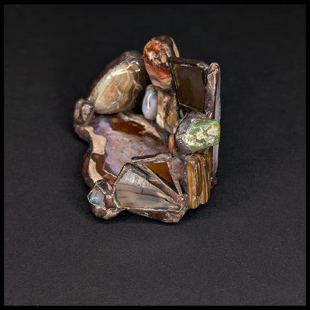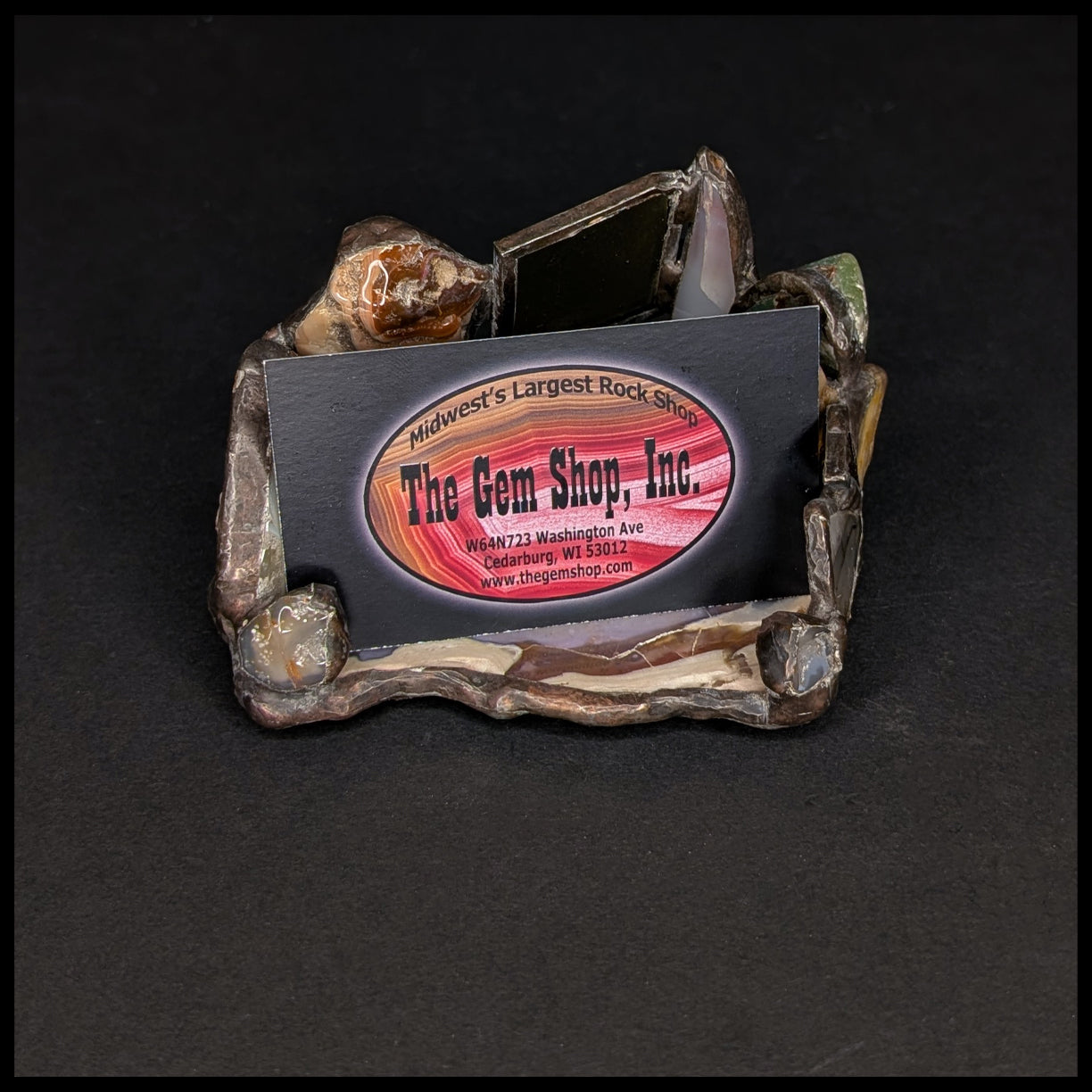 This gemstone creation can be used as a business card holder, or a cell phone stand! Created by artist Jim Pape from various gemstones and chalcedonies wrapped with copper and soldered, with an antique patina. The base has four felt pads to protect your surfaces.