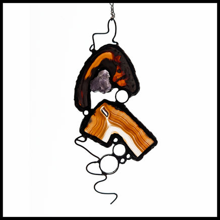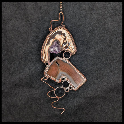 This piece combines two interesting partial slabs of Brazilian Agate, with beautiful banding, with repurposed metal and a natural Amethyst crystal.