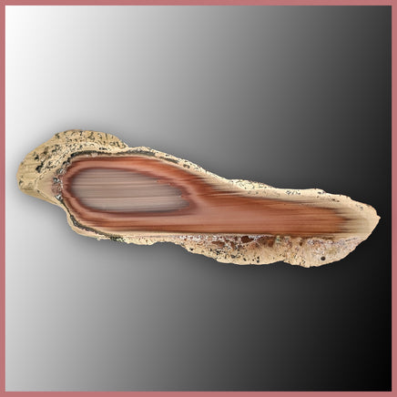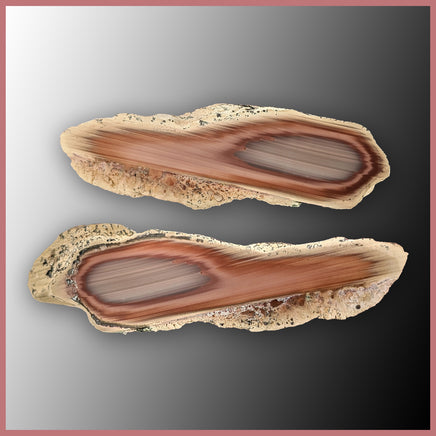 This polished Royal Imperial Jasper pair has a chalky cream outer nodule filled with pink and muted mauve jasper with horizontal banding and one egg.