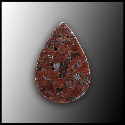 This polished Kingstonite cabochon features a brick red matrix, spots of gray or black felsite, and veins of native copper throughout that flash in the light.