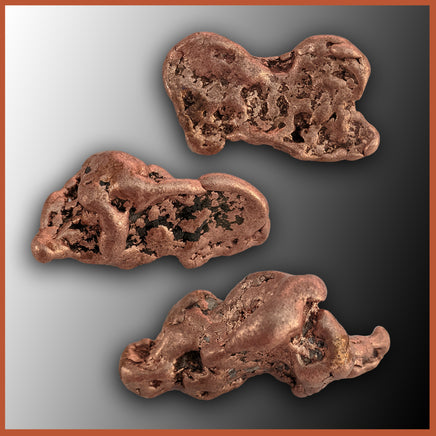 Native Copper Nuggets are all natural copper from the Keweenaw Peninsula of upper Michigan. These nuggets have been tumbled to remove the host rock, have not been heated or smelted in any way. The chemical symbol for copper is Cu.