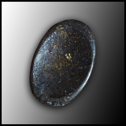 Small worry stone made from nuummite (lower grade), which is a black gabbro with inclusions that are translucent and reflective/flashy in primarily gold or blue. Worry stones are an oval shape with a slightly concave indentation for your thumb, and are polished smooth.