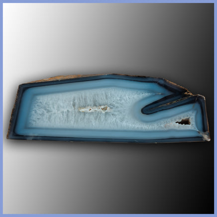 This is a polished specimen featuring shades of light and dark blue agate with quartz crystal. There is a small opening in the quartz on the side, and also a large tube formation.