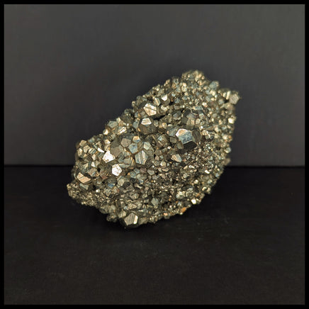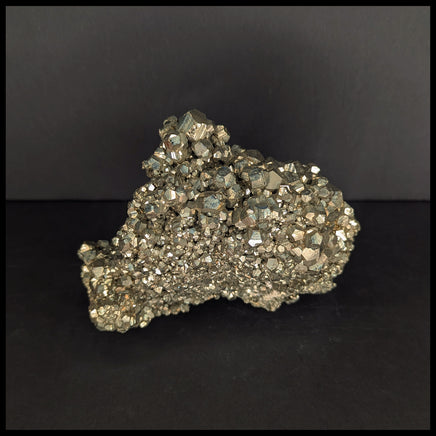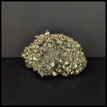 This Pyrite crystal specimen is from Peru, a prominent location for different crystal habits of pyrite. An abundant iron sulfide, the chemical formula for pyrite is FeS2. This piece features intersecting and overlapping pyritohedra, which are an asymmetric type of dodecahedron named after pyrite.