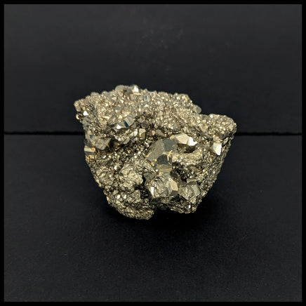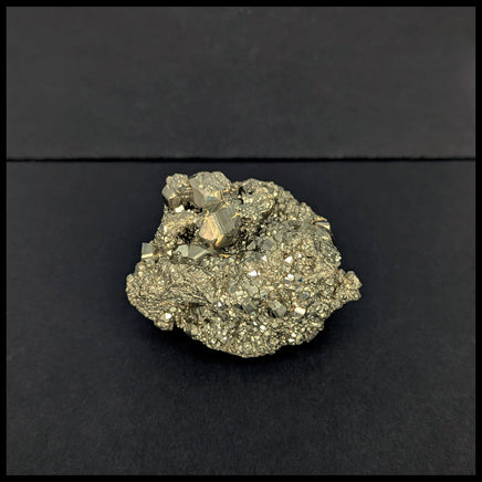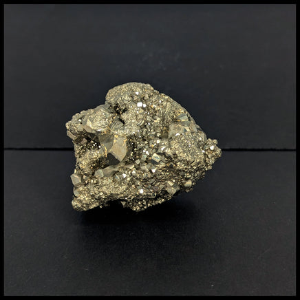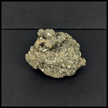 This Pyrite crystal specimen is from Peru, a prominent location for different crystal habits of pyrite. An abundant iron sulfide, the chemical formula for pyrite is FeS2. This piece features pyritohedra, which are an asymmetric type of dodecahedron named after pyrite. The sparkling crystals intersect and overlap in a variety of sizes.