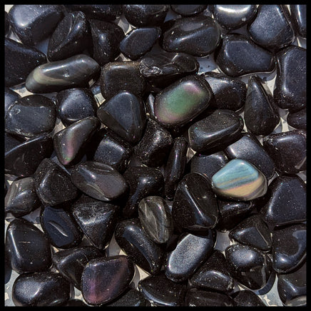 Rainbow Obsidian contains inclusions of the mineral hedenbergite, creating colors of green, purple, magenta, and yellow in circular bands.