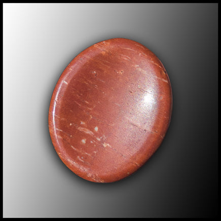 Small worry stone made from red jasper. Worry stones are an oval shape with a slightly concave indentation for your thumb, and are polished smooth.