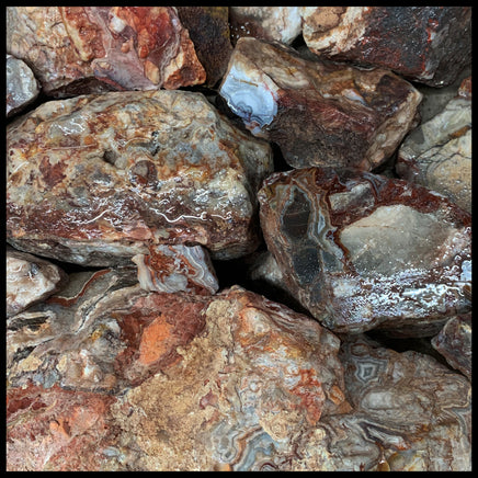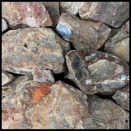 This type of lace agate has bold patterns, druzy pockets, and strong banding in white, yellow, orange, red, gray, or pink. Sold as "Red Lace" many years ago, but is also called Laguna Lace or Red Laguna Lace because of its colorful banding. Size ranges from about 2 lbs to 15 lbs.