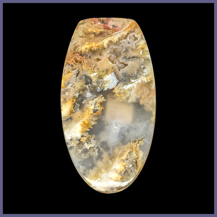 Brown, grey, white, orange, yellow, and red plumes in translucent agate.