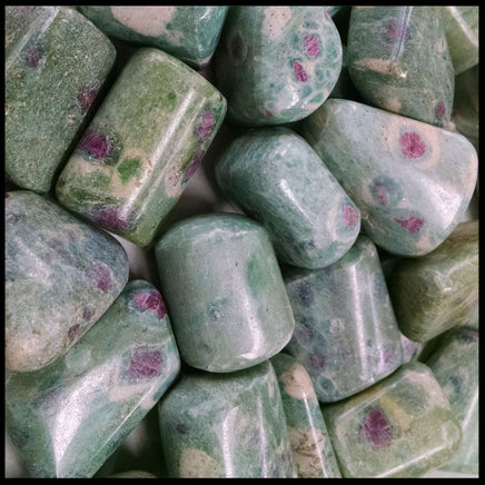 Tumbled stone from India. Displays a blue-green green color with red ruby inclusions. Most pieces fluoresce. Average size approximately 1".