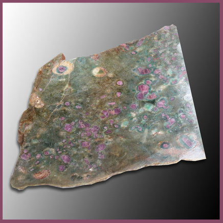 The Ruby in Fuchsite Slabs feature dark pink ruby crystals, some with a white or light blue border, in a mint green Fuchsite matrix. The slabs range in size from 1.25" - 8" wide and 4 mm - 6 mm thick.