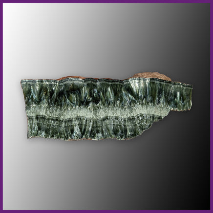 From Russia, Seraphinite is named for its feathery appearance - drawing from the biblical seraphim angels. It has metallic shades of forest green with silvery chatoyancy that appear in banded sprays. One side is polished with a thin layer of resin.