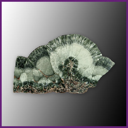 From Russia, Seraphinite is named for its feathery appearance - drawing from the biblical seraphim angels. It has metallic shades of forest green with silvery chatoyancy that appear in banded sprays. One side is polished with a thin layer of resin.
