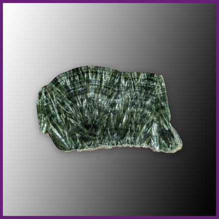 From Russia, Seraphinite is named for its feathery appearance - drawing from the biblical seraphim angels. It has metallic shades of forest green with silvery chatoyancy that appear in banded sprays. One side is polished with a thin layer of resin.