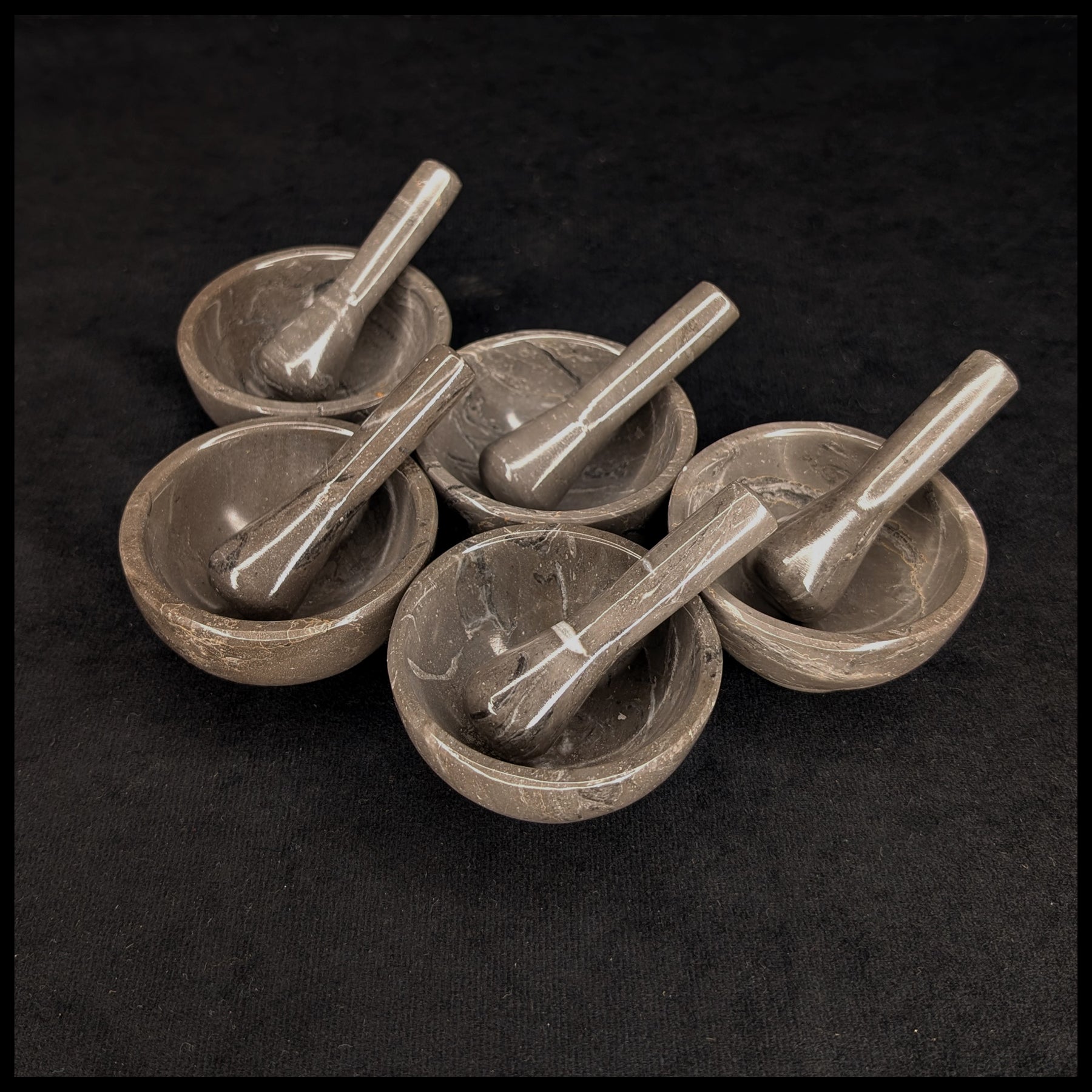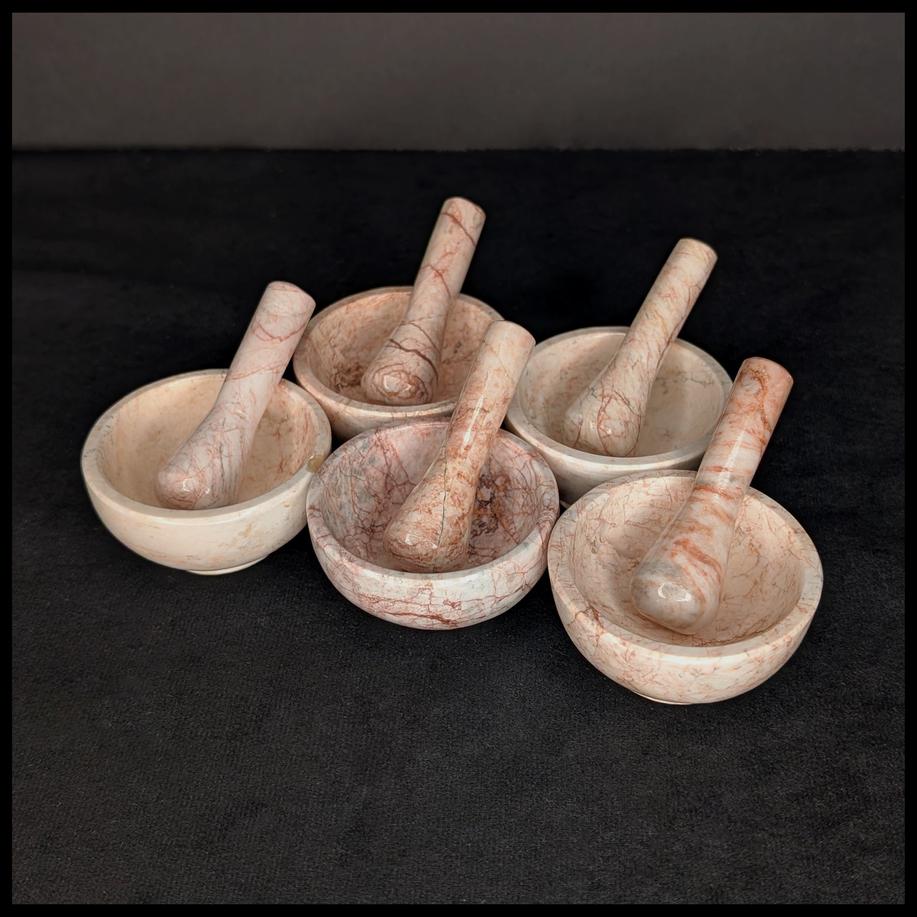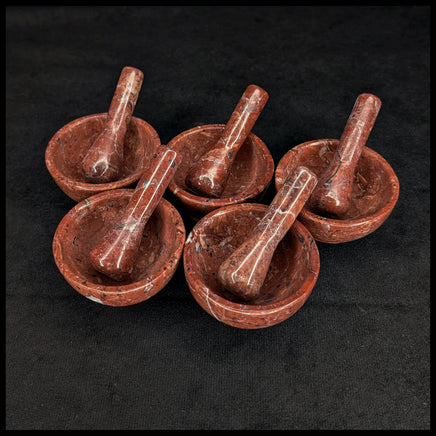 These small stone mortars and pestles are made from a variety of colors of common marbles or onyx from Mexico. Each mortar is about 2.75" across and is paired with a 3" long pestle in matching stone. The foot and the cup of the mortar are not glued together but are carved from one whole piece.