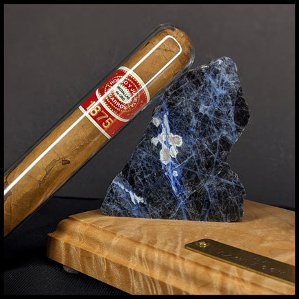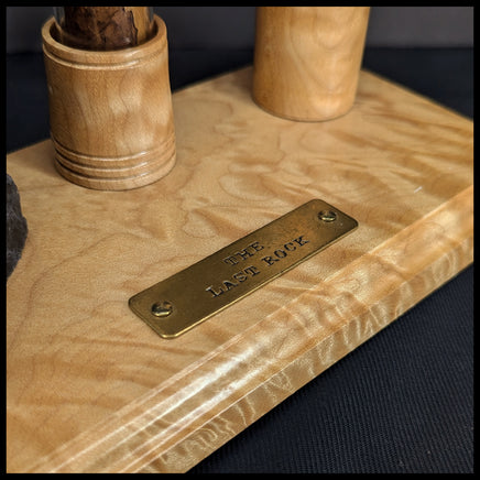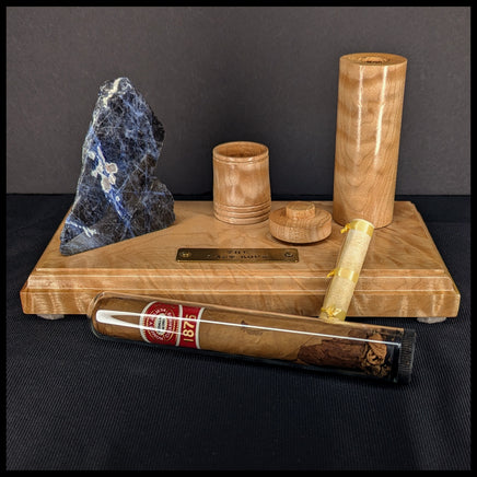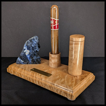 This Story Stone lapidary art piece features Sodalite, Big Leaf Maple Burl wood, and the treasured cigar of an old rockhound. Four felt circles protect the wood and display surfaces from scuffing, and a brass plate is engraved with the title. The wood next to the cigar opens to reveal a scroll printed with the story of The Last Rock.