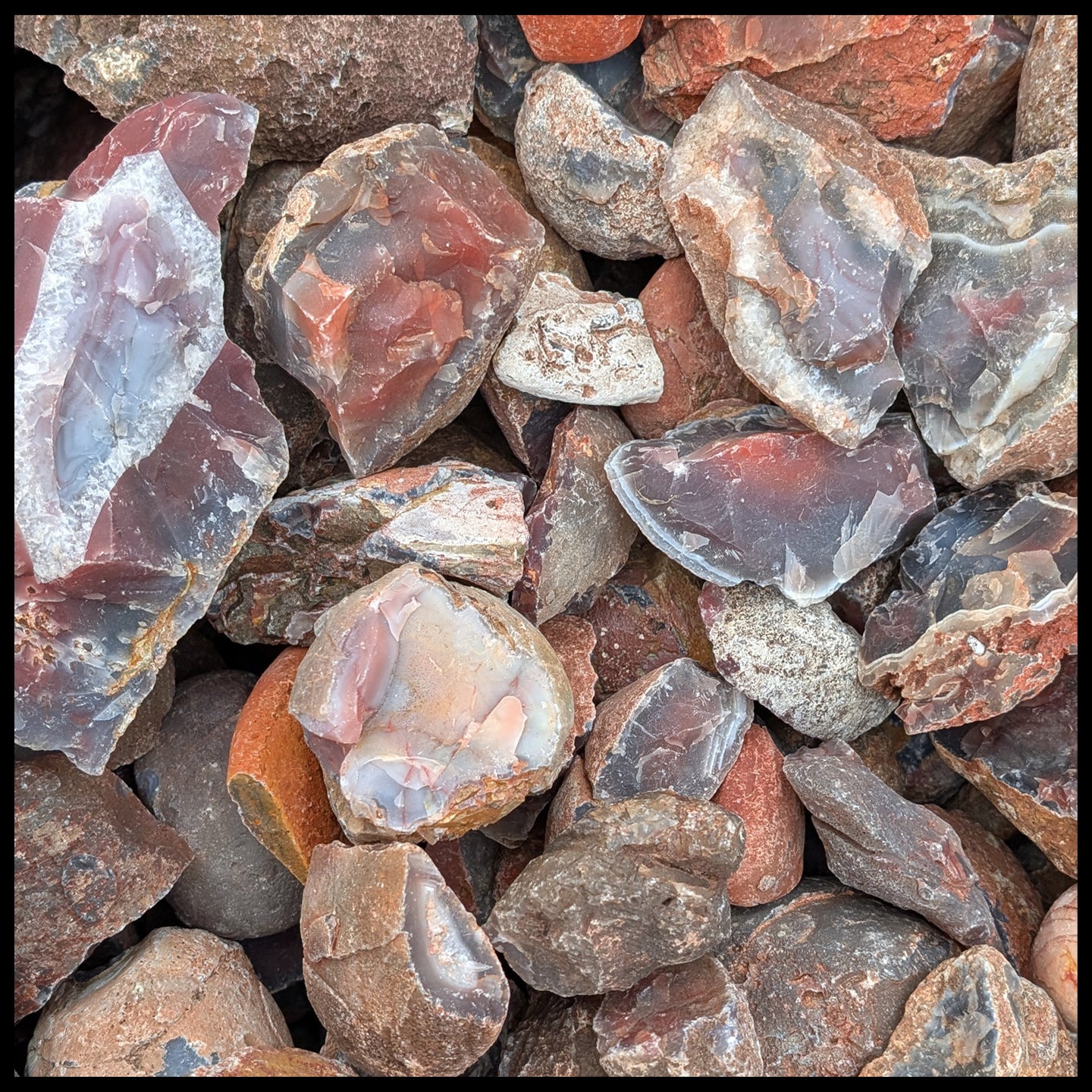 Size Range: majority ranging from 1/2" to 2" broken nodules. Larger material available but is primarily quartz filled, with a thin section of banded agate surrounding it