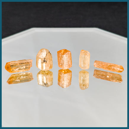 Set of 5 Golden Imperial Topaz crystals in translucent golden yellow and orange.